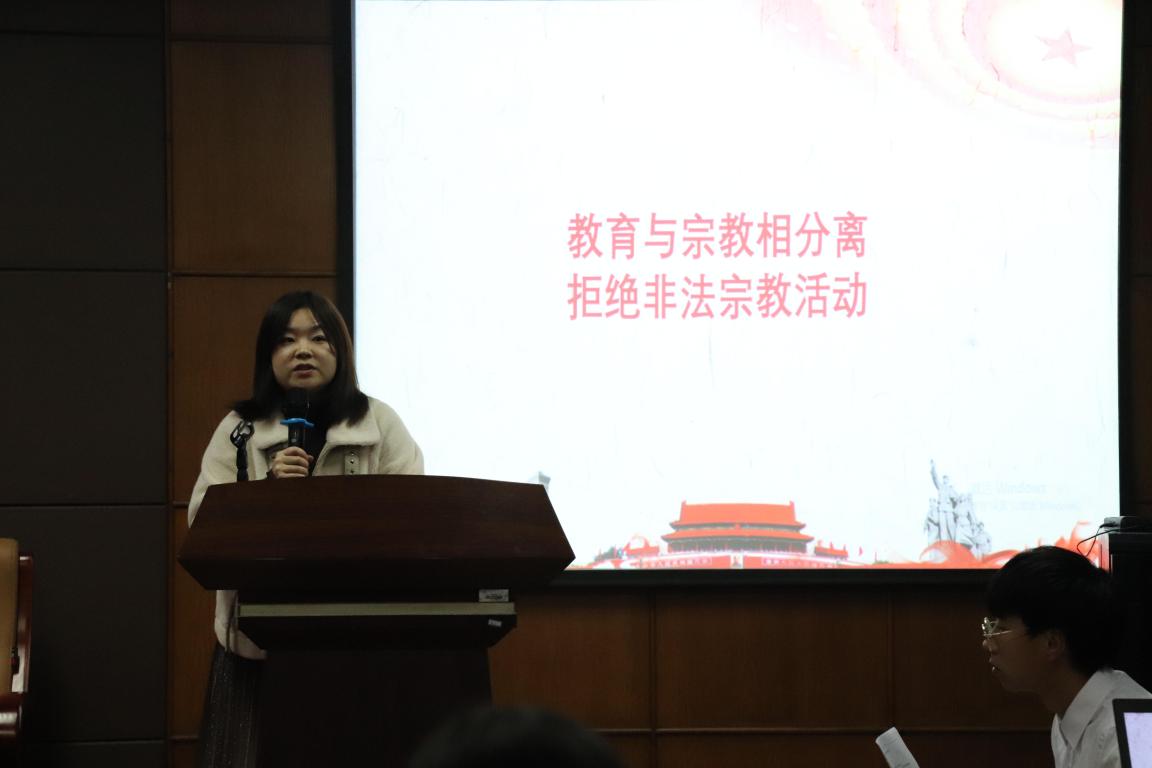 紧接着由团委、学生会指导老师李政老师发言,主题为“教育与宗教相分离,拒绝非法宗教活动”。她教导学生要依法合法的进行宗教活动,指出“大学生是祖国的未来和希望,帮助他们牢固树立马克思主义宗教观,关系高校‘培养什么人,怎样培养人,为谁培养人’”。这让全体团学成员对宗教信仰有了新的认识与了解,本次讲话,不仅对学生干部们进行了思想教育,也对新一届团学提出了严格的要求和美好的祝福。