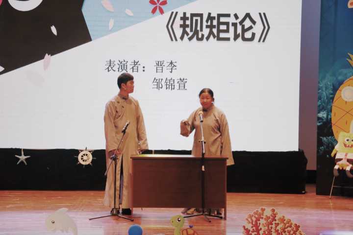 第二篇章“二氧化‘萌’”。17化类3班的晋李同学与邹锦萱同学一起为大家带来了相声——《规矩论》,妙语连珠让现场的观众乐开怀。黑料社