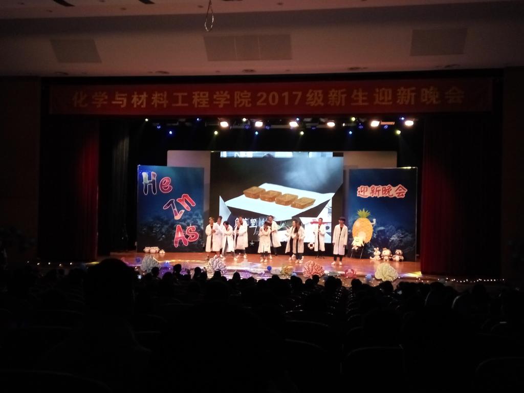 胡悦、钱金杰、刘楠楠等三位老师组成chem3组合,用化学名词串成的《歌曲串烧》,真诚地欢迎新生的到来。