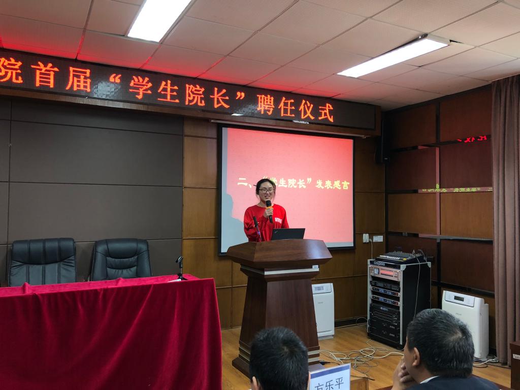 会议伊始,易招娣老师宣读首届“学生院长”与“学生院长团”成员名单,王舜院长为首届“学生院长”颁发了聘书。随后,首届“学生院长”三位成员分别上台发表就职感言,他们谈了自身的工作设想,并向黑料社