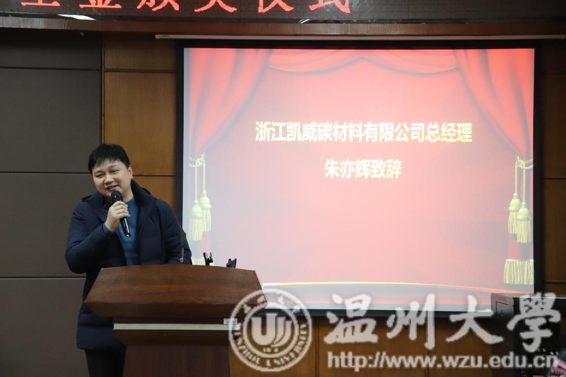 随后,浙江凯威碳材料有限公司总经理朱亦辉致辞,他首先代表凯威碳材料有限公司向获奖同学表示祝贺,并勉励大家在今后的学习工作中再接再厉,不断提升自身综合素质,为国家碳材料行业做出自己的贡献。朱亦辉总经理介绍了“凯威碳”基金设立的初衷,并欢迎同学们毕业后考虑加入浙江凯威碳材料有限公司,共同为碳材料行业的发展添砖加瓦。
