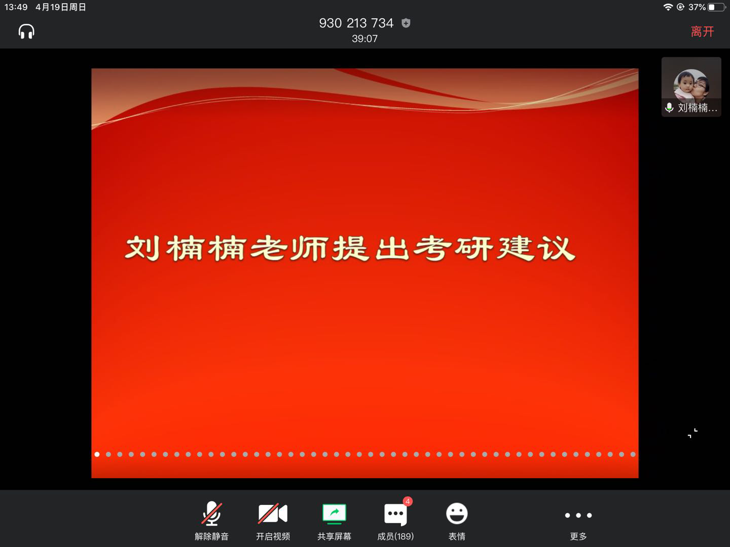 接下来,由方国勇老师向同学们介绍了现在的考研形式,较为详细地介绍了复试线、学硕、专硕的区别、适合选择的研究生专业以及不适合选择的专业、考研雷区等等考研相关的信息和往届学生踩雷得到的经验。希望同学们都可以少吃亏、高效考研。刘楠楠老师对方国勇老师的发言进行了补充和完善,提出了一些考研建议,鼓励同学们进行考研,并希望同学们在决定考研以后,可以坚持到底,不要半途而废。