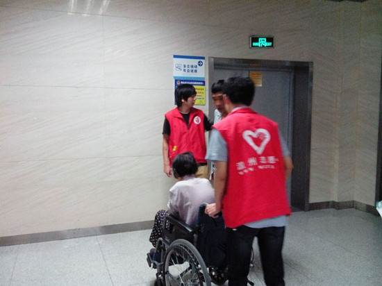 熟悉的身影,依旧在医院各个科室的自助服务机旁伫立着。面对家属手持健康卡疾步走来,队员们毫不懈怠,微笑着接过健康卡帮助家属挂号预约、缴费、充值及查询等多项业务。久久的站立,很累,但当他们明白自己的行为确实帮助到了需要帮助的人时,当家属离去留下一句句感谢时,队员们感到,一切都是值的。科室门口的服务大厅路上,也是一群熟悉的身影,两人一小组推着轮椅缓步走着。当看到病人无法行走坐在门边时,热心的队员们急忙将轮椅推上前,并问去何处。面对家属的物质感谢,队员们笑着说:“我们是志愿者”。两路队员们,做着两项不同的志愿者活动,弘扬着相同的志愿精神。
