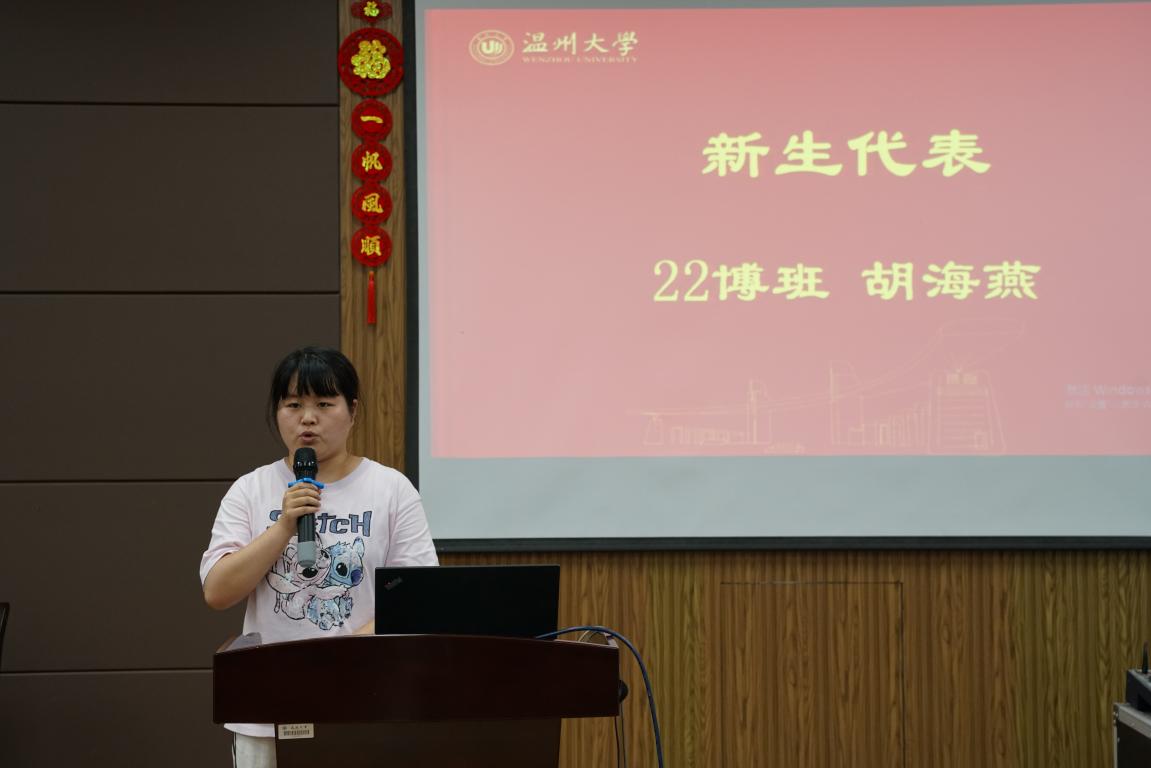 2022级博士研究生胡海燕作为新生代表,向广大新生传播了自己要将科研和学术做在祖国和温州大地上的志向,勉励同学们不断提升自我,成为有能力、有担当的科研人。