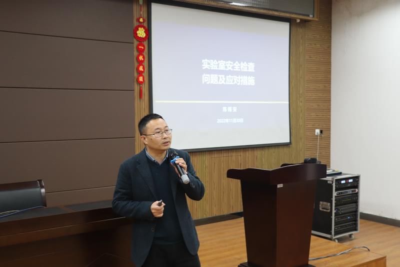 实验室安全检查存在的问题进行了通报。主要就实验室安全用电、消防设施、个人防护、通风橱使用、化学品存放、公共卫生等方面的问题进行了详细的介绍并提出了明确的整改措施。他呼吁广大教职工真正做到心中有责任、眼里有细节、实验讲规范、安全有保障。