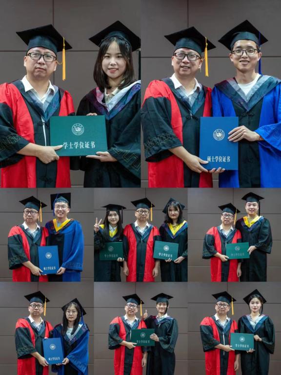 院长杨植为毕业生授予学位证书、拨穗,并合影留念。