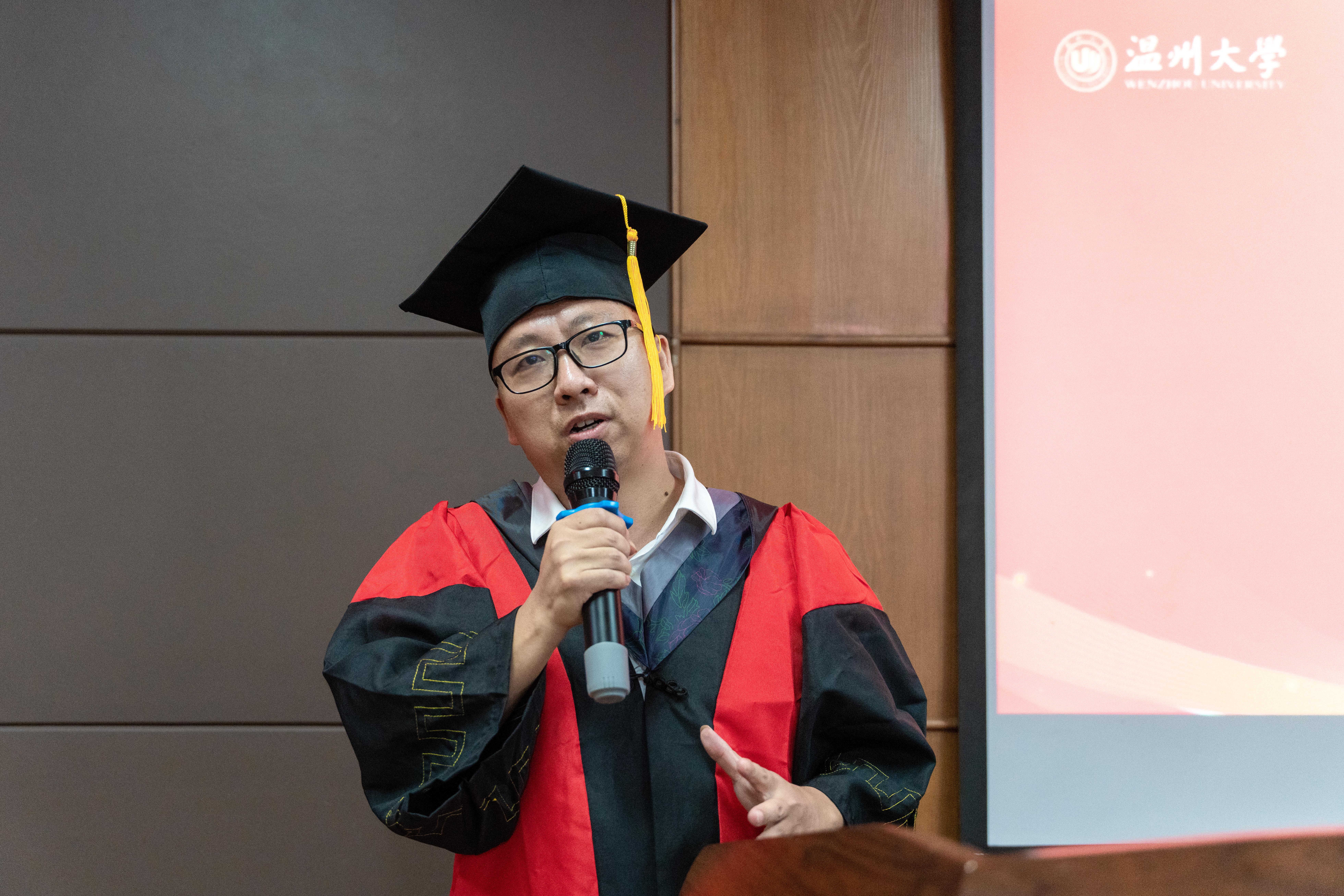 随后,19应化2班班主任徐进老师作为毕业生班主任代表进行了发言,他表示每位同学都能好好地来到毕业典礼,拿到属于自己的毕业证书,这本身是很大的一个成就,同学们可以感谢曾经的自己。最后他再次强调了“敢为人先”的校训精神,希望同学们时刻不畏困难,坚持创新。