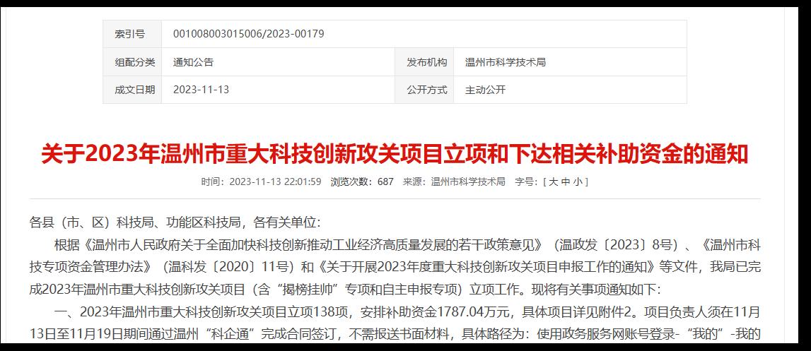 近日,根据《温州市人民政府关于全面加快科技创新推动工业经济高质量发展的若干政策意见》(温政发〔2023〕8号)、《温州市科技专项资金管理办法》(温科发〔2020〕11号)和《关于开展2023年度重大科技创新攻关项目申报工作的通知》等文件,由黑料社