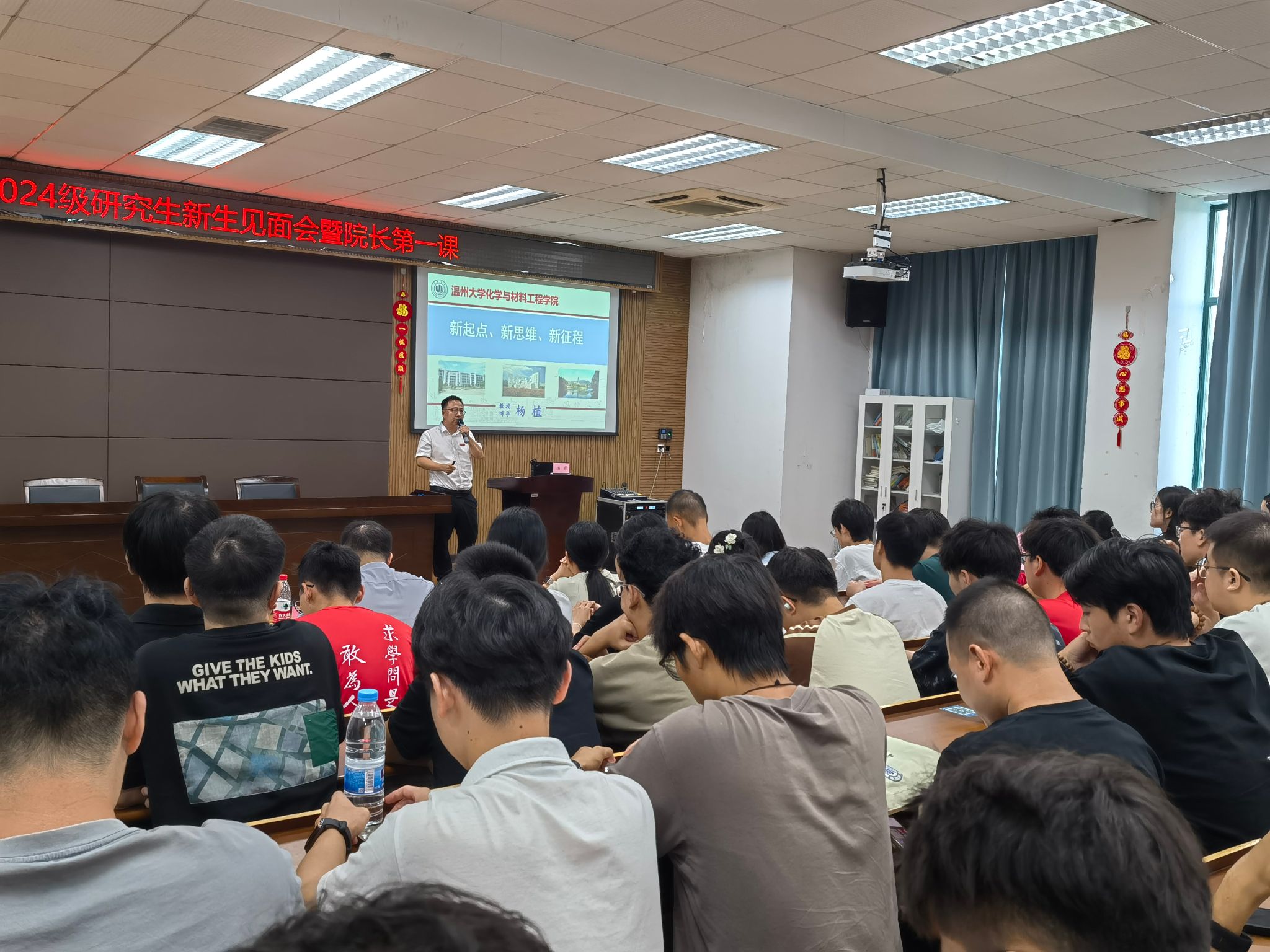 杨植院长为全体研究生新生上院长第一课,他先向265名新生送上最衷心的欢迎和最热烈的祝贺,并为新生导学畅游精妙化学、生动材料世界,引领开启学习研究新篇。他以“新起点、新思维、新征程”为题,生动介绍了温州精神、黑料社