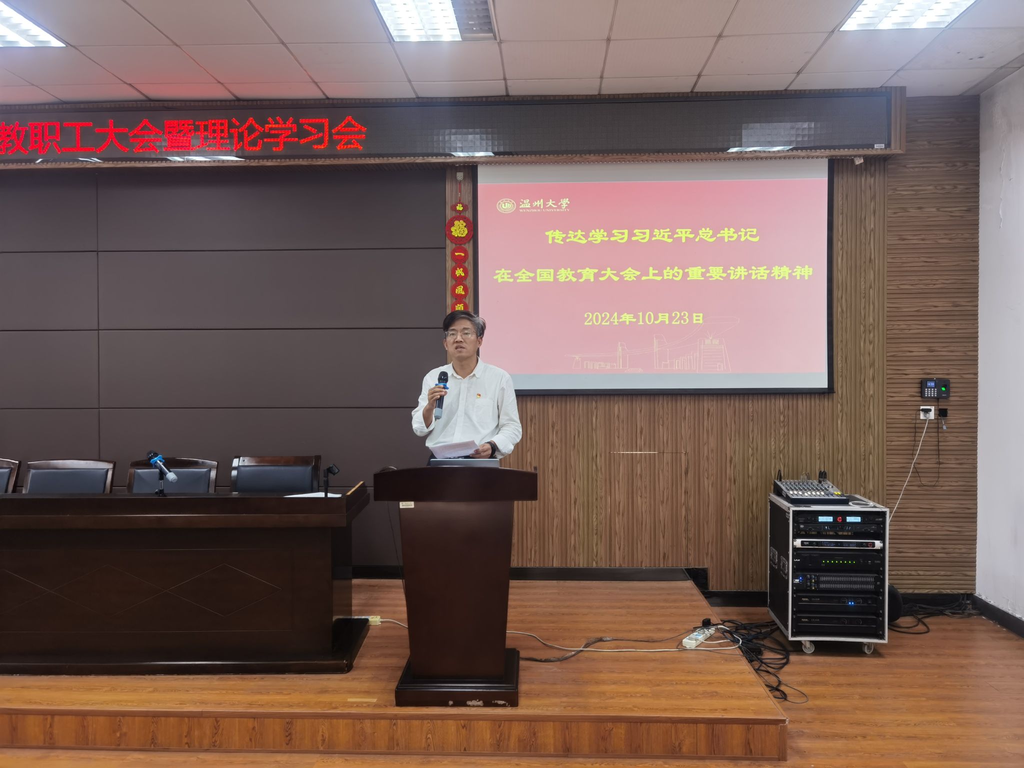 关于秋季师德师风专题教育活动的有关安排,并深入解读了习近平总书记在2024年全国教育大会上的讲话精神。他强调教育是国家强盛和民族复兴的基础,每位老师要时刻明确自己是师德师风建设的主体,增强师德师风建设的责任感。他号召全体教职工要以教育家精神为引领,以高度的政治自觉、思想自觉、理论自觉、行动自觉,树师德、正师风、铸师魂、强师能,努力做好“四有”好老师,成为新时代的“大先生”。