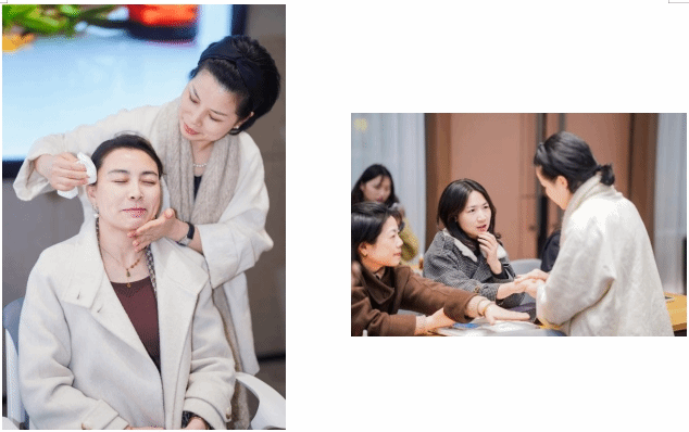在护肤与按摩环节,胡良菊老师讲解了常见的皮肤问题和针对性处理的“三度”原则。进而演示了如何通过按摩手法改善皮肤状态,特别是针对常见的皱纹问题,如法令纹、眼角纹等。她介绍了多种按摩技巧,如点指压、螺旋向上按摩等,帮助女教职工们掌握科学的护肤方法,用手法带动精油的功效叠加,促进日常压力舒缓和脸部疲态改善。