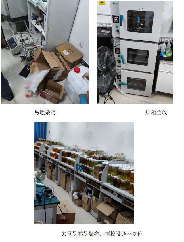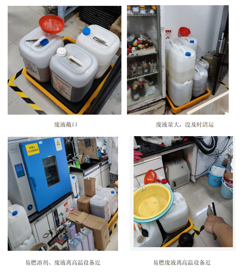 气瓶离高温炉过近,废液桶敞口,有试剂无标签 |
