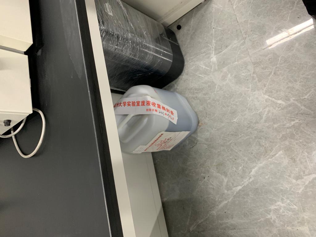 试剂瓶无标签;废液桶摆放区域未贴警戒线 |