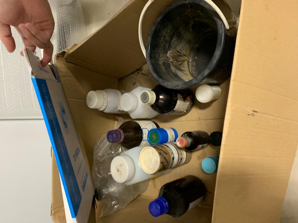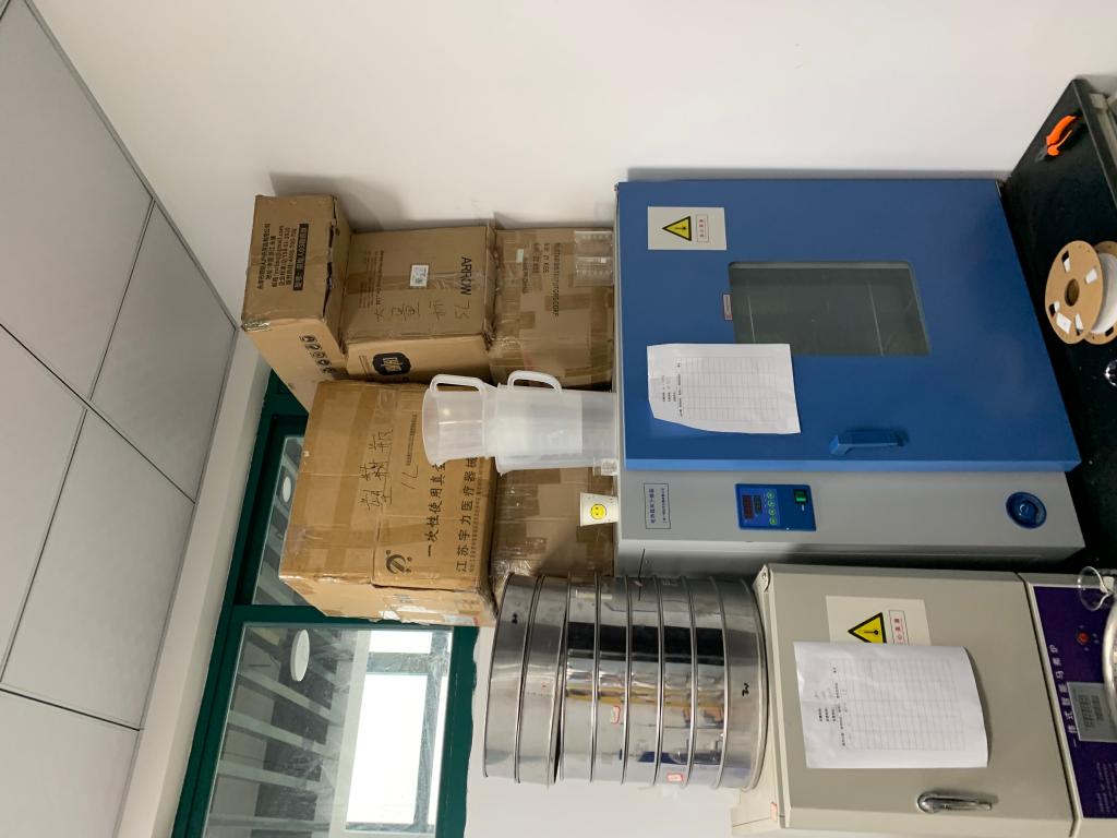 废液桶未贴标签;试剂瓶未贴标签;烘箱上面堆积纸板箱 |