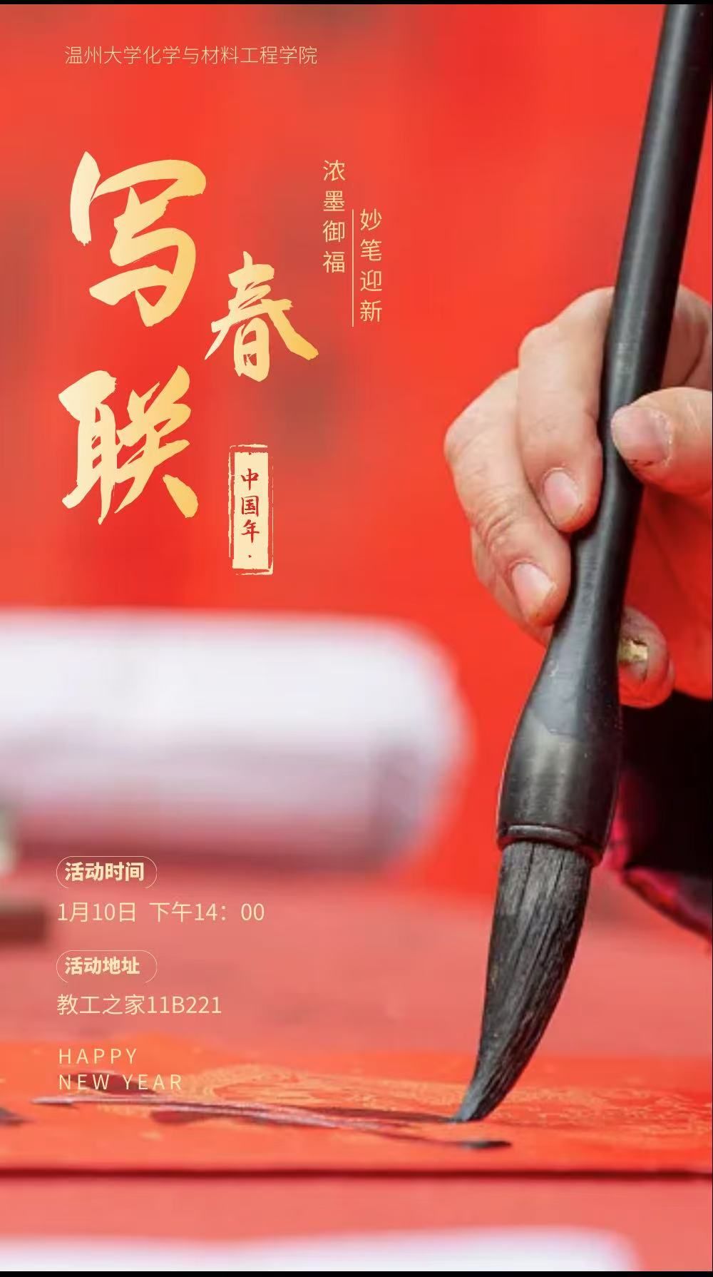 为迎接2025年农历新年的到来,黑料社 工会、研会在教工之家组织开展“龙含宝珠辞旧岁,蛇吐瑞气贺新春”为主题的迎新春为写春联、写福活动,现将有关事项通知如下: