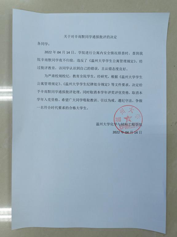 关于对辛雨默同学通报批评的决定