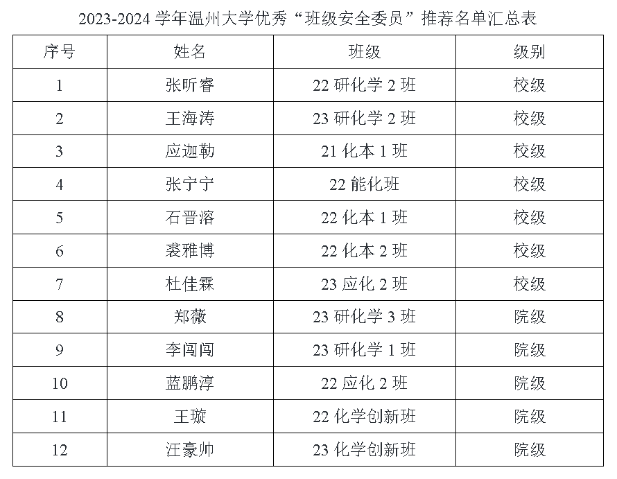 评选,推荐张昕睿等12位学生为2023-2024学年优秀“班级安全委员”拟获得者。现将名单予以公示,请各班级以及个人认真核对,如有异议请于公示期内与学工办联系。