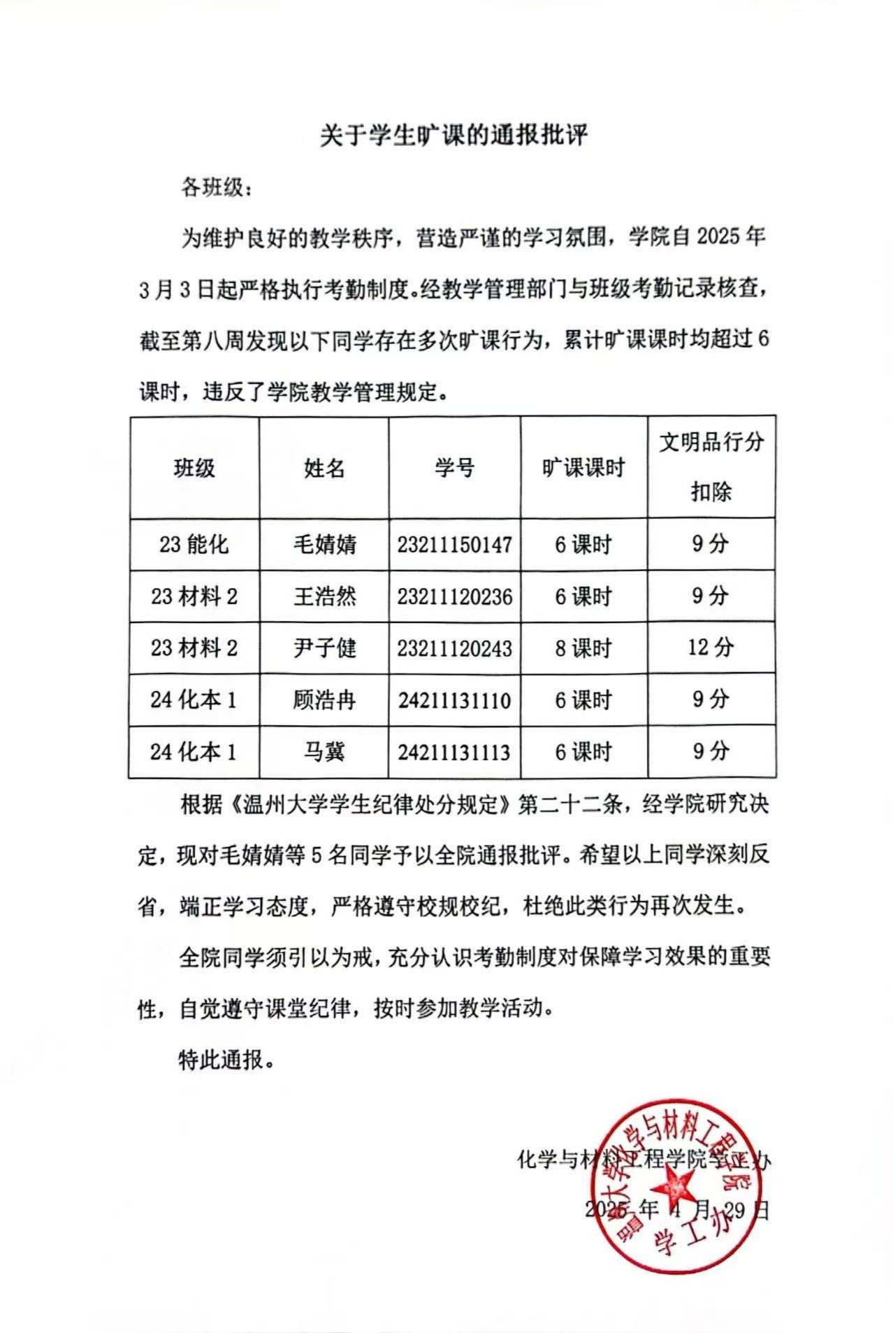 关于学生旷课的通报批评