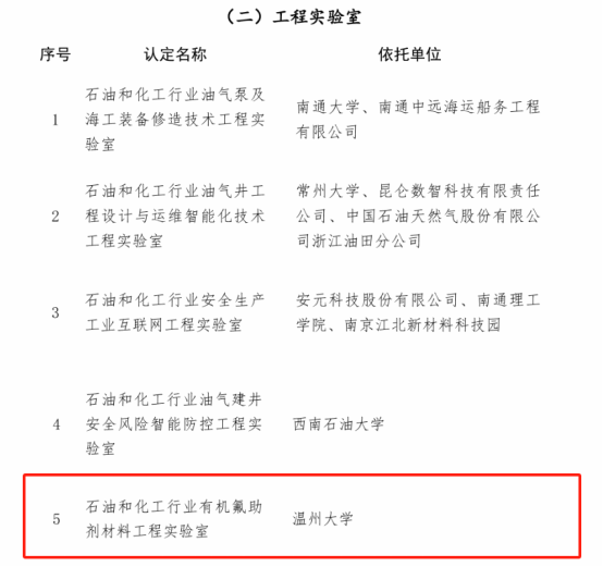 金辉乐教授团队牵头申报的石油和化工行业有机氟助剂材料工程实验室成功获批。据了解,这是我市首个获批的石油和化工行业实验室。