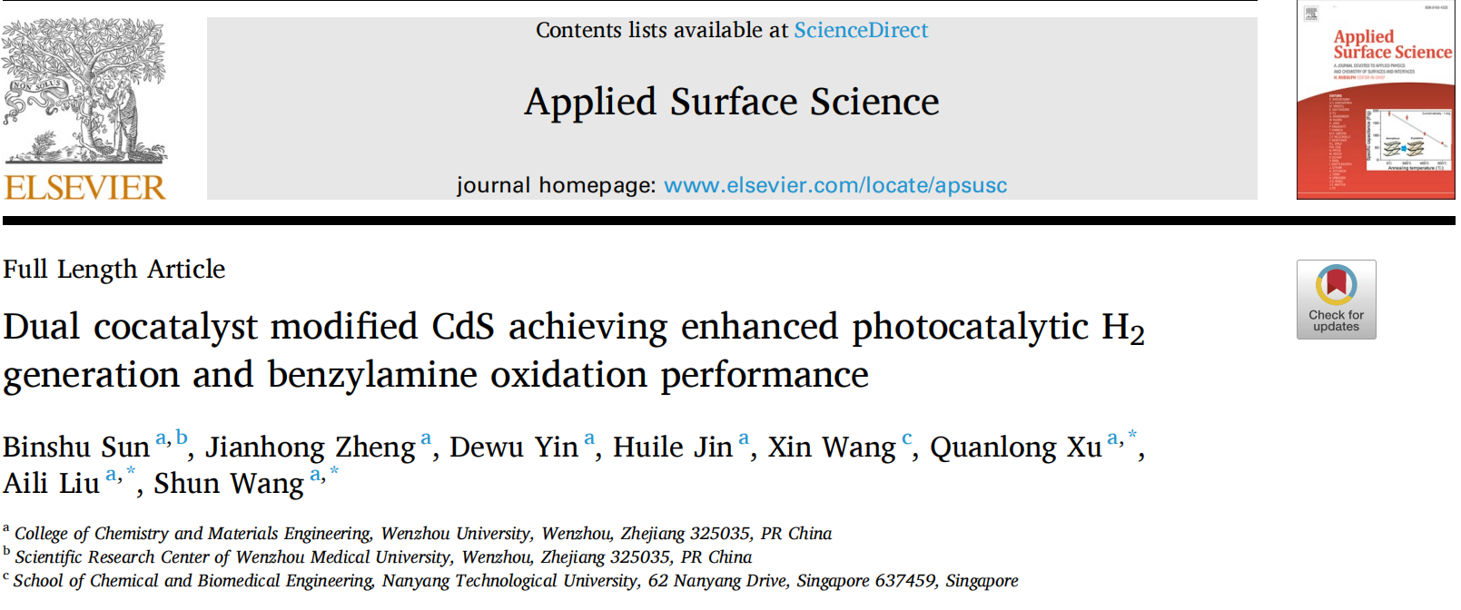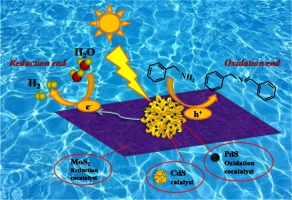 徐全龙副教授在国际著名化学期刊《Applied Surface Science》发表了题为”Dual cocatalyst modified CdS achieving enhanced photocatalytic H2 generation and benzylamine oxidation performance”的论文。通过微波辅助合成的方法合理制备出三元PdS/CdS/MoS2光催化剂。在光催化反应过程中,CdS的光生电子会转移到作为还原助催化剂的MoS2表面参与还原反应,而其空穴会迁移到作为氧化助催化剂的PdS表面参与氧化反应,从而实现了电子和空穴对在空间上的分离。此外,水还原产生氢气的反应和苄胺氧化产生硝基苯的反应分别发生在不同的助催化剂表面,这有助于充分利用光生电子和空穴对,且具有低的反应活化势垒,从而表现出优异的光催化水分解产生氢气和苄胺氧化性能。