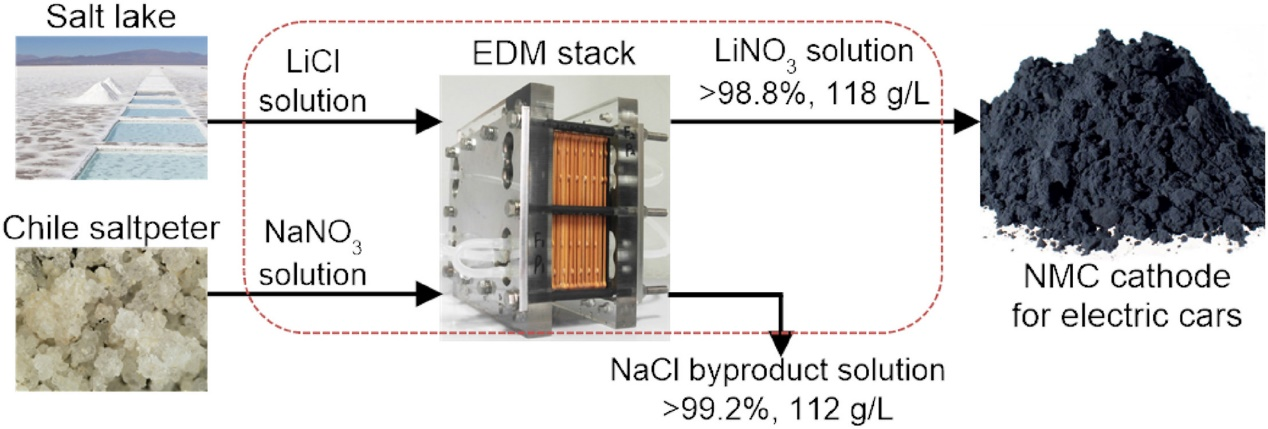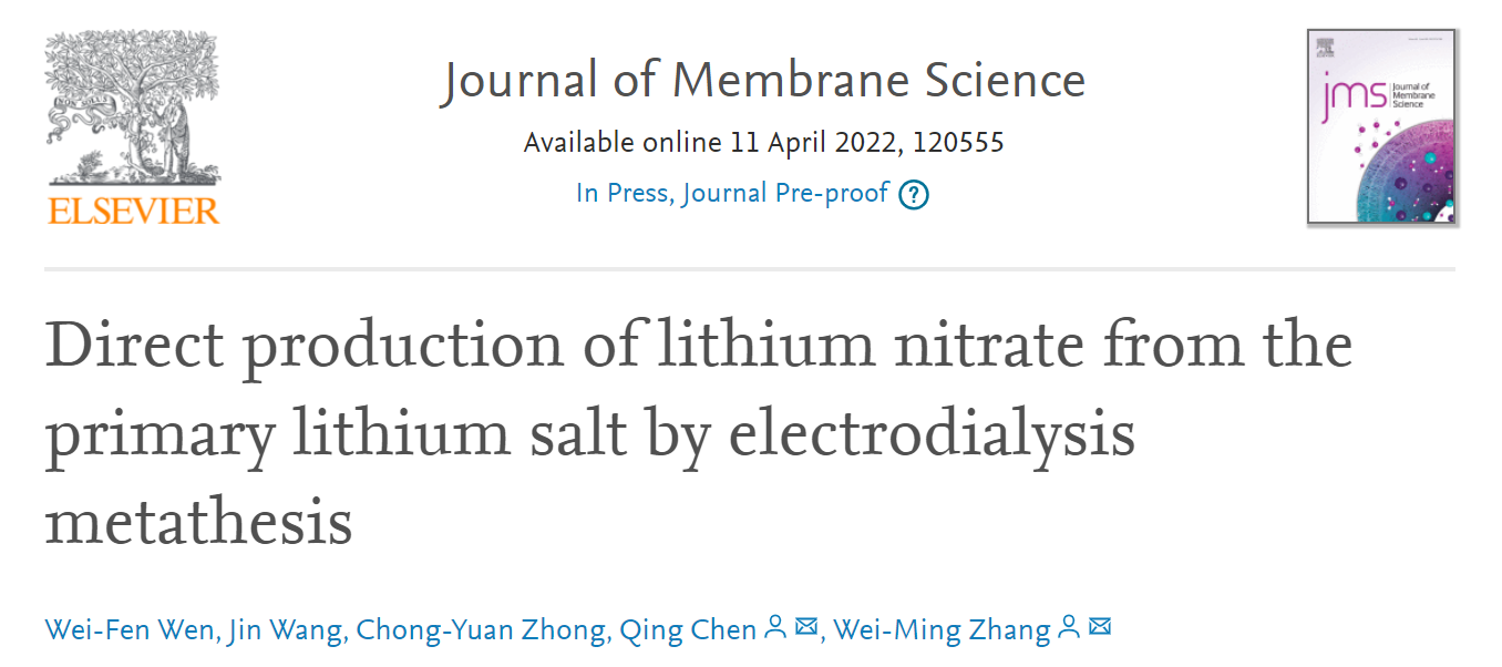 张伟明教授课题组在国际著名化学期刊《Journal of Membrane Science》发表了“Direct production of lithium nitrate from the primary lithium salt by electrodialysis metathesis”的论文。该工作实现锂资源的转化,直接从含有锂离子和相应阴离子的两种进料盐中生产锂盐产品,获得高价值LiNO3产物。
