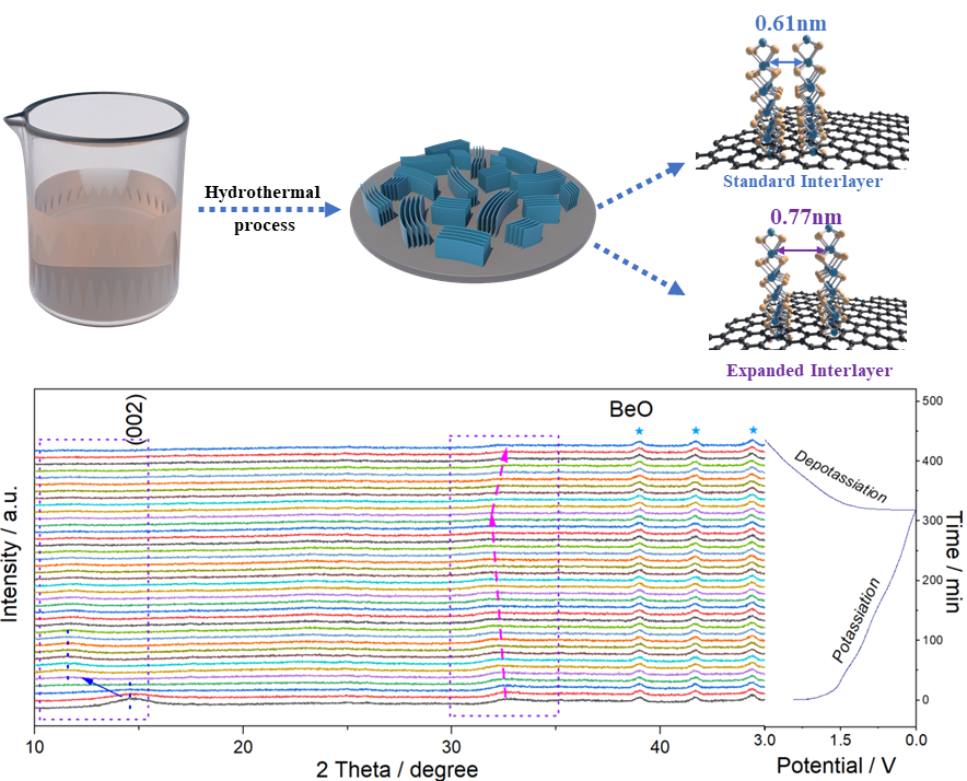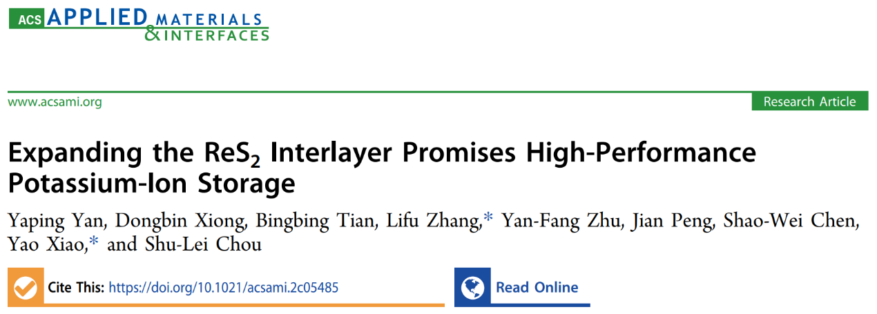 碳中和技术创新研究院肖遥团队在国际权威期刊《ACS Applied Materials & Interfaces》(//pubs.acs.org/doi/abs/10.1021/acsami.2c05485)上发表题为“Expanding the ReS2 Interlayer Promises High-Performance Potassium-ion Storage”的研究论文。本文利用二维层状材料的特点,采用二维材料层间距扩大的策略,通过简单的水热法,在还原氧化石墨烯(rGO)表面上合成了扩层的ReS2纳米片。所制备的ReS2纳米片的层间距为~ 0.77 nm,远大于扩层前的0.61 nm。采用原位XRD技术研究了ReS2在钾离子电池中的离子存储机制,揭示了钾离子在扩层ReS2中嵌入和转换两种混合的模式。扩层的纳米复合材料在0.05、0.2 和 1.0 A/g电流密度下表现出 432.5、316.5和241 mAh/g的高比容量,并在1A/g的电流密度下,表现出优异的可逆性。总体而言,这种材料局域化学策略也为其他材料的开发应用提供了新的借鉴。