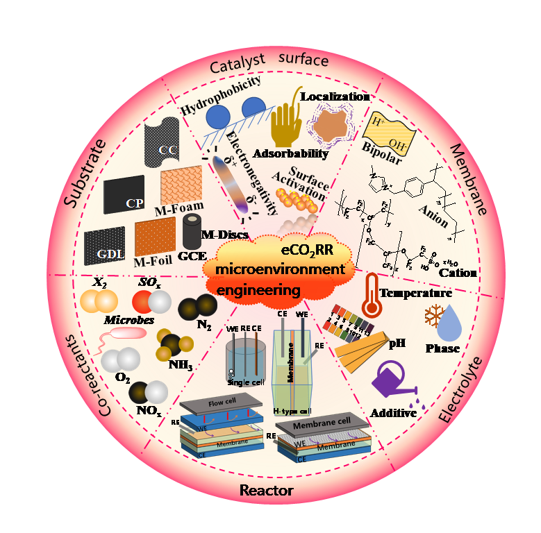 图1. 不同微环境调节 eCO2RR催化性能的方案示意图。