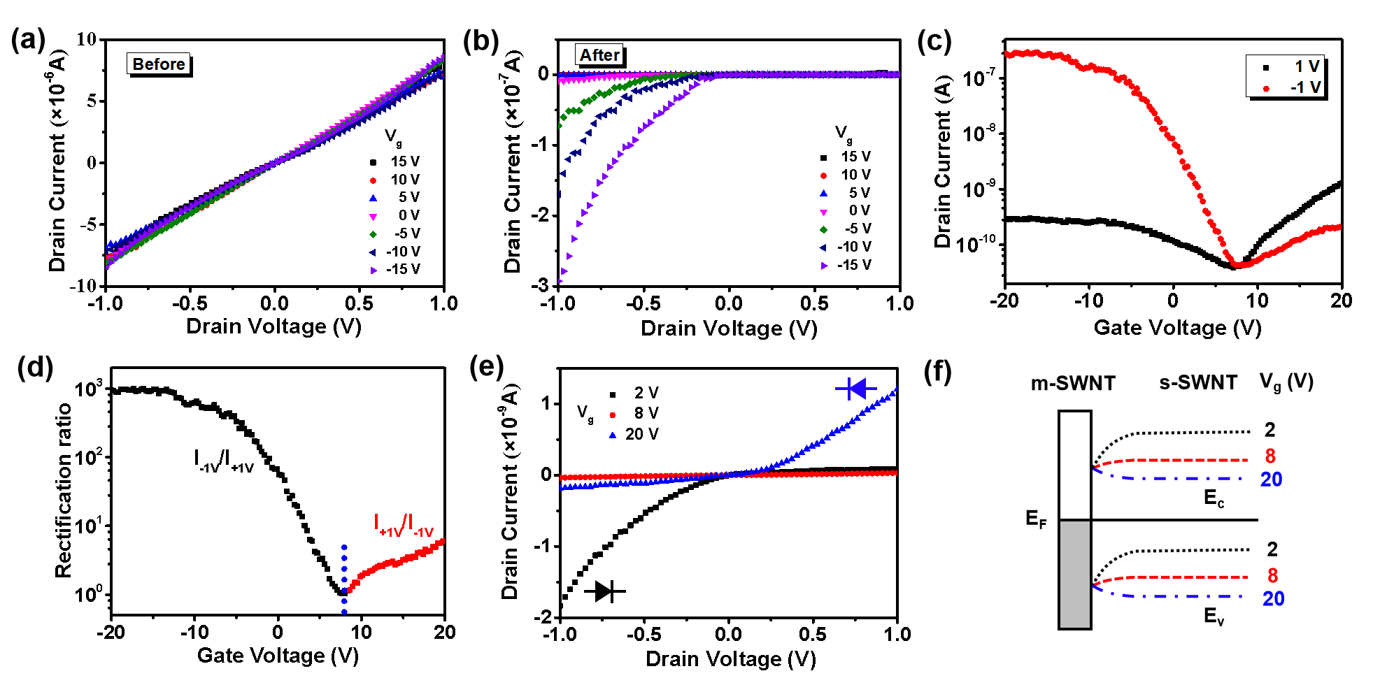 单壁碳纳米管具有独特的电子结构和优越的性能,被认为是下一代纳电子学的理想材料之一。对于全碳器件来说,单壁碳纳米管肖特基结是必不可少的元件。肖特基结一般在金属-半导体界面形成肖特基势垒(即电子的势能势垒),从而表现为二极管的特性。肖特基结可以作为各种电路的基本组成部分,例如整流器、场效应晶体管、透明导电薄膜、开关、光电器件。因此,如何开发一种低成本、高度可控的单壁碳纳米管分子内肖特基结制备方法是促进全碳基电子器件发展的关键。
