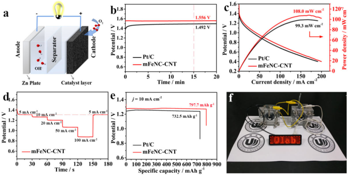 (2)丰富的Fe-Nx位点降低了破坏O=O键的能垒,表现出更高的ORR活性。通过实验和理论证明,优化后的mFeNC-CNT表现出较高的ORR活性,其半波电位为0.908 V。同时,由其制备的锌空气电池具有高达1.556V的开路电压,优于商业铂碳。