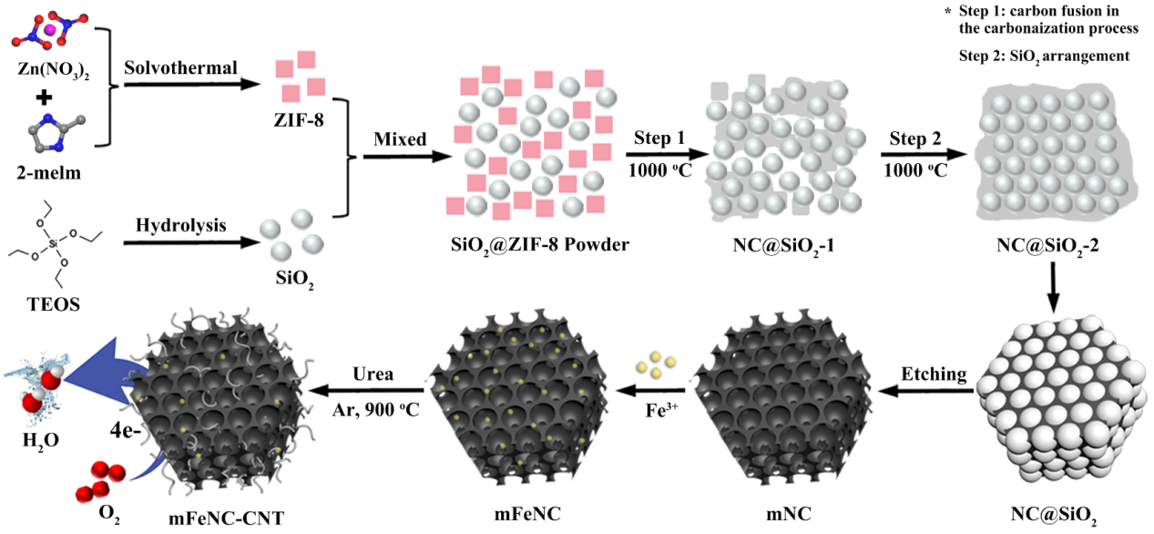 钱金杰副教授等人通过二氧化硅模板法,并以ZIF-8颗粒作为碳源,便捷地合成一种多等级的三维有序多孔碳纳米材料。在进一步通过添加铁源后,高温热解获得的多孔mFeNC-CNT具有超细的Fe纳米颗粒以及由氮掺杂石墨碳配位的原子级分散的Fe-Nx位点。