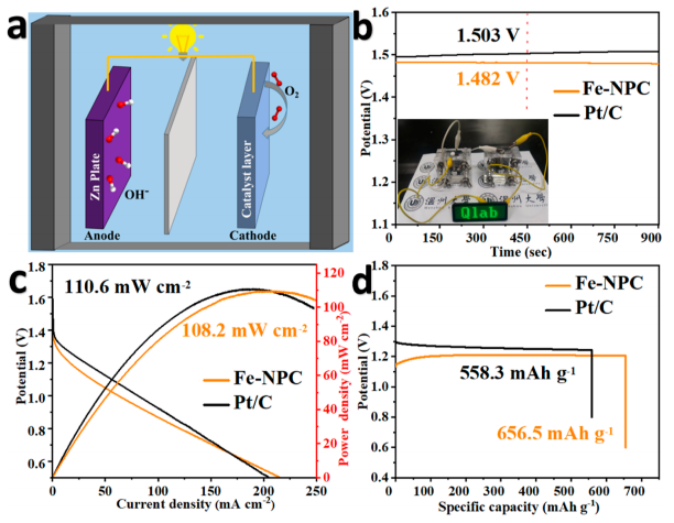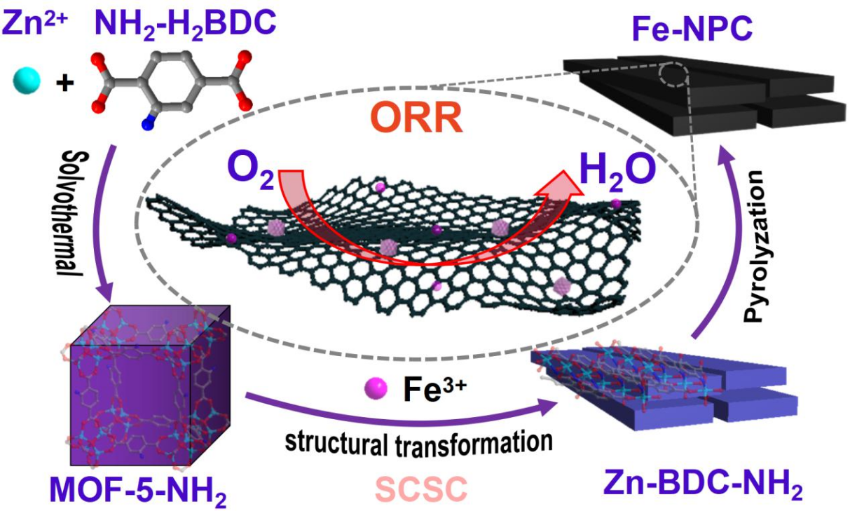钱金杰课题组通过溶剂热法和高温碳化法制备了一种具有优异电催化性能的MOFs衍生碳纳米材料。以氨基(-NH2)修饰的MOF-5-NH2晶体为前驱体,引入主要活性物种Fe(III),受-NH2基团静电力作用和诱导配位作用,从而引发了由立方块状(MOF-5-NH2)单晶结构到片状(Zn-BDC-NH2)单晶结构的转变。高温热解后得到的Fe-NPC碳纳米片具有丰富的氮掺杂、分散的铁纳米颗粒、良好的导电网络和高的比表面积,因此表现出高效的氧还原反应性能。其中,性能最优的Fe-NPC的起始电位仅为0.972 V,极限扩散电流密度为5.412 mA/cm2,循环稳定性良好。此外,其组装的锌空电池展现出大功率密度(108.2 mW/cm2)和高比容量(656.5 mAh/g)。