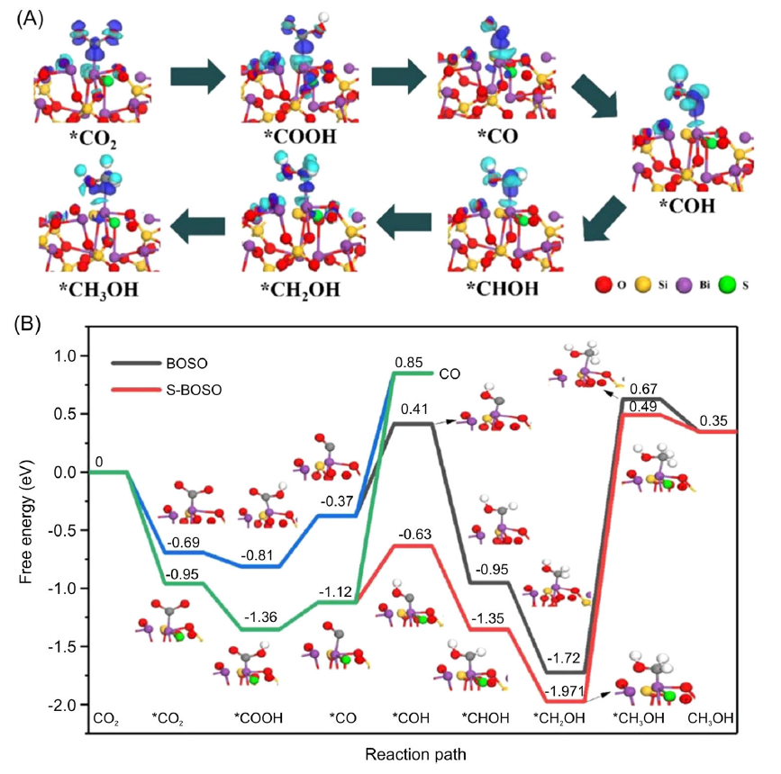 料的设计,以实现更广泛的应用。S-BOSO催化性能的提升主要来自于以下三个方面:(1)扩宽的可见光吸收范围;(2)增强的光生载流子分离效率;(3)电荷富集的Bi位点降低了CO2还原反应速率限制步的能垒。该研究为设计具有高活性无机半导体CO2还原光催化剂提供了新思路,也为低浓度CO2转化及太阳燃料光催化剂的设计提供了重要参考。