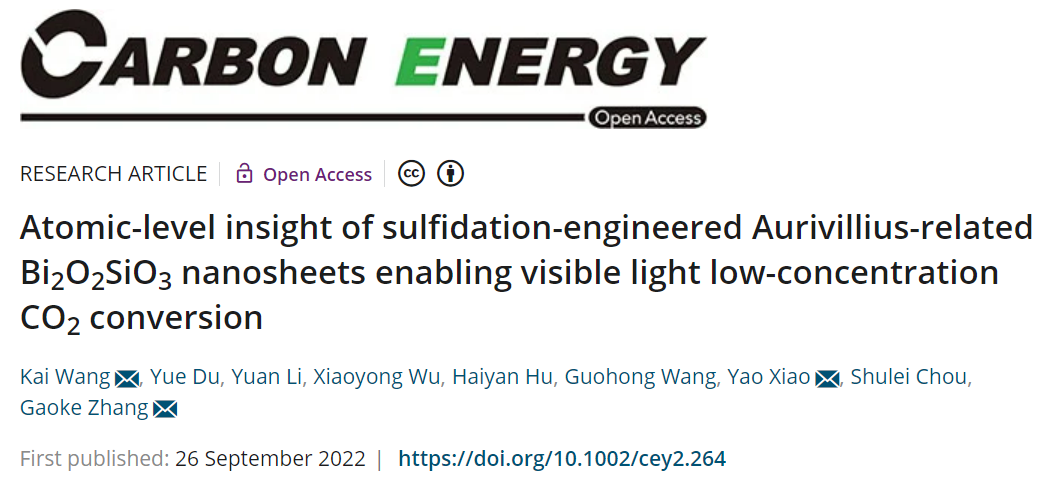该成果以“Atomic-level insight of sulfidation-engineered Aurivillius-related Bi2O2SiO3 nanosheets enabling visible light low-concentration CO2 conversion”为题发表在高水平期刊Carbon Energy(IF: 21.556)。湖北师范大学王楷副教授为第一作者,黑料社