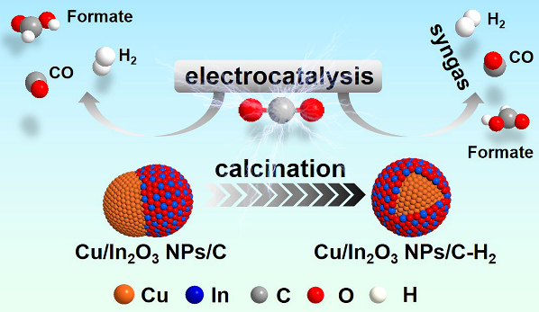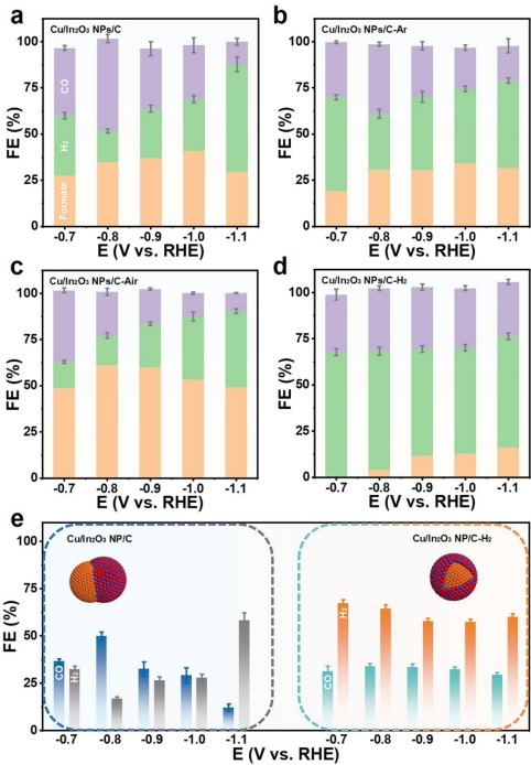 王娟副教授成功制备了相和结构可控的Cu/In2O3纳米颗粒(Cu/In2O3 NPS)并将其作为CO2RR电催化剂。其中Cu/In2O3 NPS-H2在较宽电位范围内的CO/H2比值保持恒定且总的FE始终维持在90%以上。