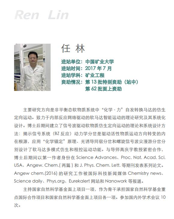 任林教授以第一作者身份连续在顶刊Sci. Adv.、 Proc. Nat. Acad. Sci. USA、Angew. Chem.(两篇)和J. Phys. Chem. Lett.等期刊发表系列论文。Angew chem.的顺逆活性运动工作被国际科技新闻媒体Chemistry News、Science daily、Phys.org、Eurekalert网站和Nanowork等报道。博士后期间获中国博士后基金会第13批特别资助(站中)和第62批面上资助,同时作为主持人获得国家自然科学基金面上项目一项,作为骨干承担国家自然科学基金重点国际合作项目和国家自然科学基金面上项目各一项。参加国内外学术会议10次。