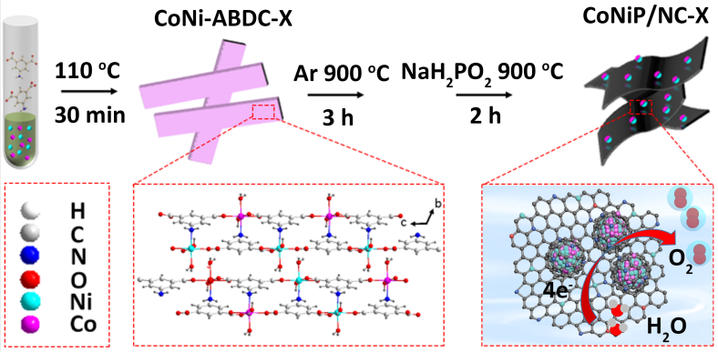 钱金杰课题组以一系列Co/Ni基同构MOF(CoNi-ABDC)为前驱体,经过碳化及磷化处理后合成了双金属磷化物纳米颗粒锚定的氮掺杂碳纳米条复合材料CoNiP/NC-X,可将其作为高性能OER催化剂。所获得的CoNiP/NC-1纳米带具有良好的纳米结构、高比表面积、适量的杂原子掺杂、丰富的催化活性位点和高度石墨化的碳网络。因此,该材料在碱性溶液中表现出良好的准四电子OER性能,当电流密度为10 mA cm-2时,过电位为330 mV,Tafel斜率为80.5 mV dec-1,并在10 h稳定性测试后电流保持率为94.27%。