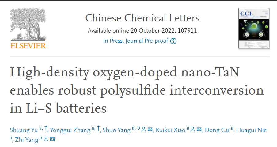 相关研究成果以“High-density oxygen-doped nano-TaN enables robust polysulfide interconversion in Li−S batteries”为题发表在《Chinese Chemical Letters》(IF=8.455)上,黑料社