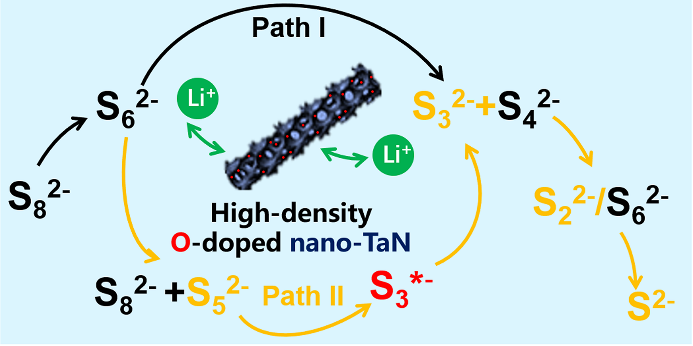 杨植教授团队开发了一种多孔高密度氧掺杂氮化钽纳米结构(nano-TaNO)作为高效催化剂应用于锂硫电池中。nano-TaNO内部和表面都形成了均匀的纳米孔通道,具有储存更多的硫物种、易于电解液渗透和良好的电子/Li+传输等优点。更重要的是nano-TaNO中高密度O掺杂不仅提供了高导电性,还通过Li−O化学相互作用和激发S3*−自由基的生成促进了多硫化物的吸附/转化,开辟了从S8到Li2S新的转化路径。因此,即使在高硫负载条件下,nano-TaNO正极也表现出优异的比容量和可循环性。该项工作表明,氮化钽和大量阴离子掺杂工程在调控多硫化物中间体的形成和制造高性能锂硫电池方面具有巨大的潜力。