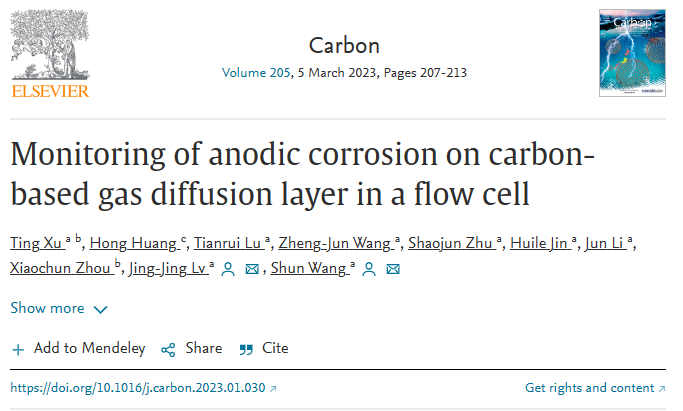 该成果以“Monitoring of anodic corrosion on carbon-based gas diffusion layer in a flow cell”为题发表在Carbon期刊(IF=11.307,JCR一区)上。黑料社