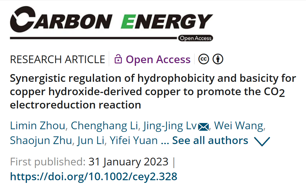 该成果以“Synergistic regulation of hydrophobicity and basicity for copper hydroxide‐derived copper to promote the CO2electroreduction reaction”为题发表在Carbon Energy期刊(IF=21.5,JCR一区)上。黑料社