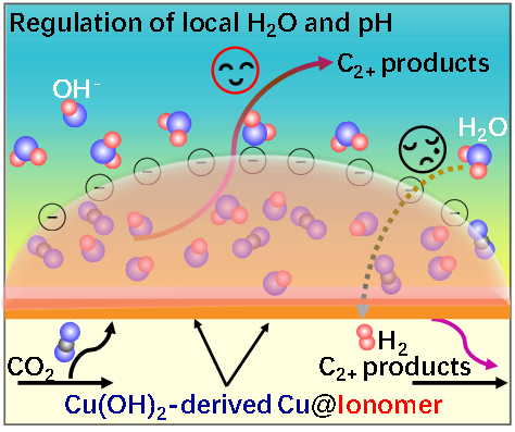 图1:协同调节Cu表面疏水性和酸碱度促进电催化还原二氧化碳性能示意图