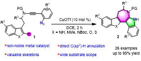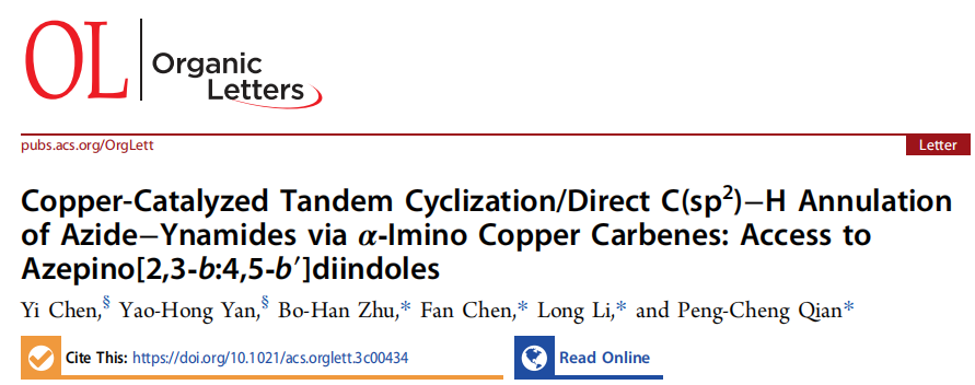 钱鹏程-李龙博士课题组通过α-亚胺基铜卡宾的策略,开发了一种新的铜催化苯基叠氮炔酰胺的串联环化/直接C(sp2)-H环化,这种廉价金属催化的环化反应具有良好的产率和、优异的化学选择性,和 底物普适性等优点。