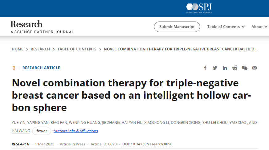 该成果以“Novel combination therapy for triple-negative breast cancer based on an intelligent hollow carbon sphere”为题发表在国际权威期刊《Research》上,IF:11.036,中科院期刊分区表1区。黑料社