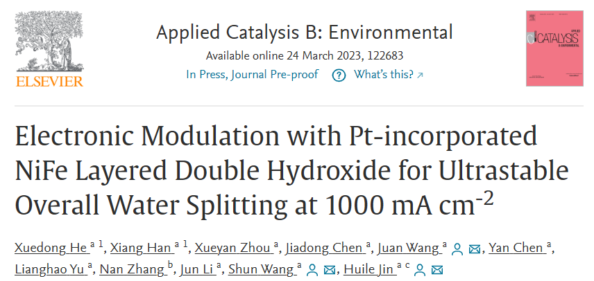 这一研究结果以“Electronic Modulation with Pt-incorporated NiFe Layered Double Hydroxide for Ultrastable Overall Water Splitting at 1000 mA cm-2”发表在国际期刊《Applied Catalysis B: Environmental》(IF=24.319),黑料社