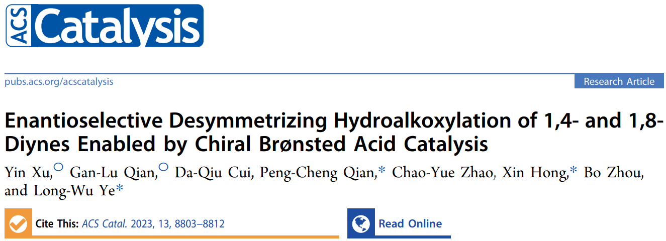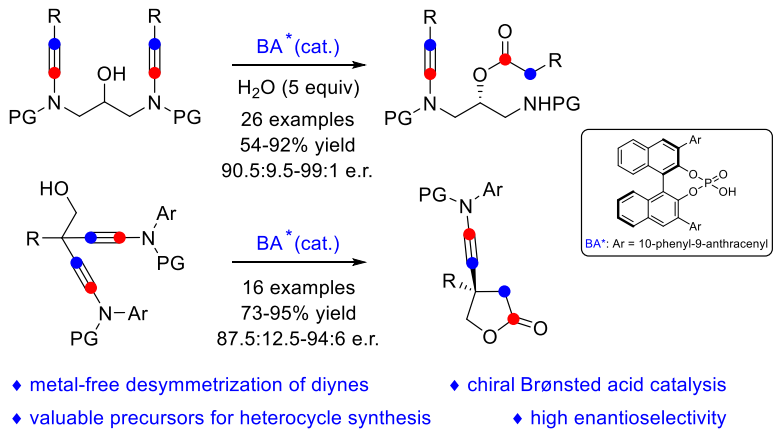钱鹏程教授课题组与厦门大学叶龙武教授课题组合作以简单易得的炔酰胺为底物,实现了手性Brønsted酸催化的去对称化反应。该反应具有如下特点:(1)首例手性Brønsted酸催化二炔的去对称化反应;(2)宽广的底物普适性(适用于1,4-和1,8-二炔);(3)优异的对映选择性。