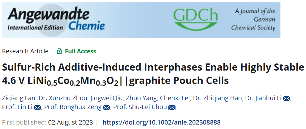 碳中和技术创新研究院李林团队联合华南师范大学曾荣华教授、李键辉博士在国际权威期刊Angewandte Chemie International Edition上发表题为《Sulfur-Rich Additive-Induced Interphases Enable Highly Stable 4.6 V LiNi0.5Co0.2Mn0.3O2||graphite Pouch Cells》的学术论文。本论文通过在4.6 V LiNi0.5Co0.2Mn0.3O2(NCM523)||石墨软包电池中引入含硫量为34.04%的超高含硫量添加剂(甲烷二磺酸亚甲酯,MMDS),从而构建了一种由添加剂诱导形成的稳固富硫电极-电解液面相。在4.6 V高电压条件下,循环800次,含MMDS添加剂的NCM523||石墨软包电池仍具有87.99%的高容量保持率以及更好的倍率性能,且与较低硫含量的一系列添加剂做对比,突出了高含硫量添加剂MMDS的优势。结合实验表征以及理论计算,进一步探究了MMDS添加剂在溶剂中的优先氧化还原性,从而证明它能够优先在正负极上界面构筑稳定的富硫电极-电解液界面膜,该界面相的存在成功稳定了高电压NCM523||石墨软包电池,显著提高了电池的循环稳定性。同时实验结果也表明MMDS分解所构筑的富硫界面相在抑制电解液消耗、产气以及稳定电极材料、减少过渡金属溶出上有着非常好的效果。黑料社相关的文章发表在Angewandte Chemie International Edition上,黑料社