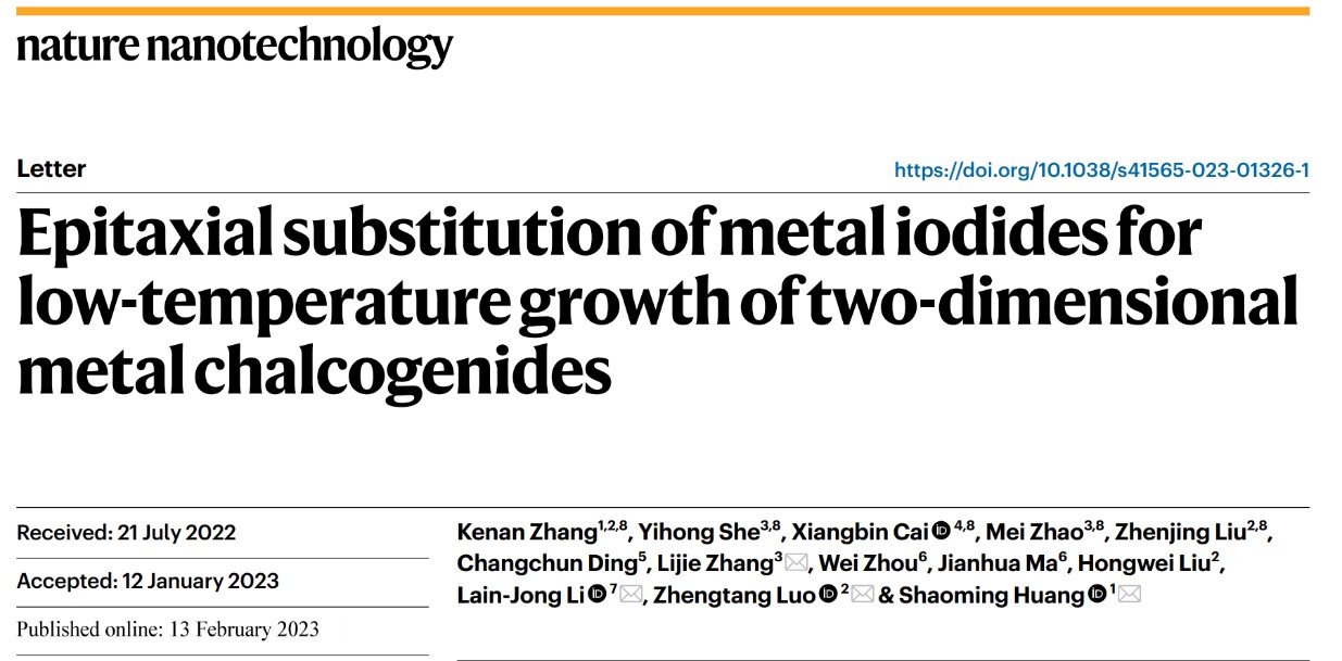 张礼杰与广东工业大学黄少铭、香港大学李连忠、香港科技大学罗正汤等合作,针对二维材料及异质结与半导体芯片单片集成面临的温度限制难题,设计了一种普适性的范德华衬底协同二维碘化物低温原位替代生长方法,实现了 17 种高质量二维金属硫化物及其异质结的超低温可控生长(≤ 400℃)。结合理论计算,阐明了超低温原位替代生长机理,揭示了硫元素替换碘元素的低取代势垒微观本质,提出了碘化物硫(硒、碲)化的生长机理:替换反应优先发生在缺陷或边缘区域,之后的原子替代能垒大幅下降,发生了类似涟漪效应的连续 S-I 原子替换反应。并且在< 400℃下实现了多种二维材料及其异质结的大面积阵列集成,所制备的材料具有高的结晶质量和优异的光电性能。为二维材料与半导体芯片后端制造工艺的温度兼容性问题提供了一种可行性方案,并且为二维材料及其异质结的单片集成提供了一种新思路。该研究成果以“Epitaxial substitution of metal iodides for low-temperature growth of two-dimensional metal chalcogenides”为题目发表在在材料领域国际顶级学术期刊《Nature Nanotechnology》,黑料社