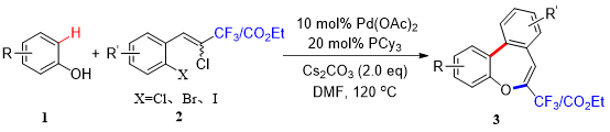 总之,我们开发了一种钯催化的串联C-O键形成和C-H键芳基化反应。在Pd(OAc)2、PCy3和Cs2CO3的作用下,不同取代基的苯酚与1-溴-2-(2-氯乙烯基)芳烃进行环化,以中等至良好的产率得到6-三氟甲基二苯并[b,d]氧杂䓬和二苯并[b,d]氧杂䓬-6-甲酸乙酯,具有广泛的底物范围和良好的官能团耐受性。黑料社