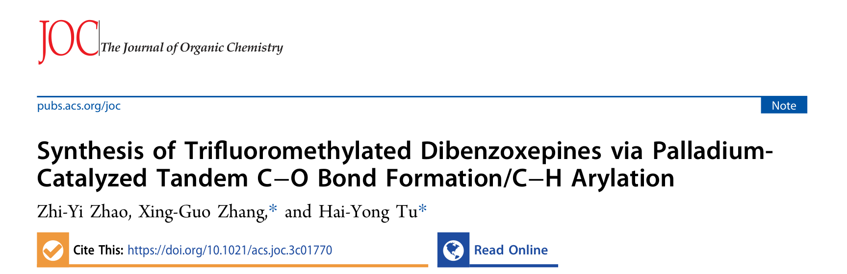 张兴国教授、涂海勇副教授、硕士生赵治义发展了一种钯催化串联C-O键形成和C-H芳基化反应,为合成6-三氟甲基二苯并[b,d]氧杂䓬提供了一种简便高效的方案。相关成果以标题 “Synthesis of Trifluoromethylated Dibenzoxepines via Palladium Catalyzed Tandem C-O Bond Formation/C-H Arylation ” (DOI: org/10.1021/acs.joc.3c01770 ) 发表在The Journal of Organic Chemistry 上。在该工作中,作者以不同取代基的苯酚与2-氯-1-(邻卤代芳基)-3,3,3-三氟丙烯进行反应,得到了一系列的三氟甲基取代的二苯并氧杂䓬。作者以苯酚与1-溴-2-(2-氯-3,3,3-三氟丙-1-烯-1-基)苯为模板底物对反应条件进行了筛选。最终确定最优条件为:醋酸钯为催化剂,三环己基膦为配体,碳酸铯为碱,超干溶剂N,N-二甲基甲酰胺为溶剂,在氮气氛围中120oC反应24小时,产率达74%。