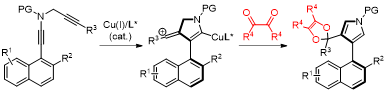 钱鹏程教授等人在知名的期刊《Chem. Commun.》上发表了题为” Copper-catalyzed atroposelective formal [4+1] annulation of 1,2-diketones with vinyl cations”的文章。本文报道了铜催化1,2-二酮不对称形式[4+1]环化反应合成了具有应用价值的轴手性化合物。作者基于发展成熟的铜催化二炔化合物生成的具有远程手性的烯基阳离子中间体,设计了具有位阻效应的萘基取代的二炔底物。二炔底物在手性铜催化下可以生成具有轴手性的烯基阳离子中间体,随后该中间体再由1,2-二酮捕获发生[4+1]环化反应顺利的合成具有高对映选择性的轴手性化合物。该反应具有良好的官能团兼容性以及广泛的底物普适性。此外,产物可进行简单的衍生化得到不同的具有轴手性化合物的产物。值得一提的是,该反应是首次报道不对称催化1,2-二酮的[4+1]环化反应。
